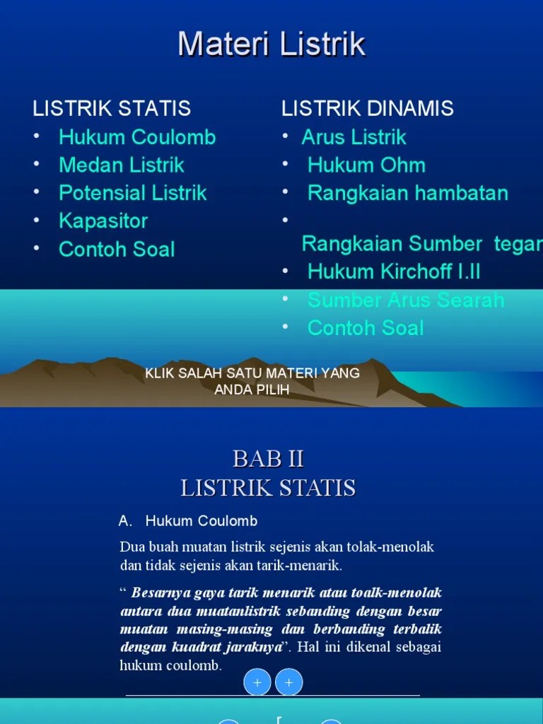 Materi listrik listrik statis • hukum coulomb • medan listrik • potensial listrik • kapasitor • contoh soal listrik dinamis • arus listrik .