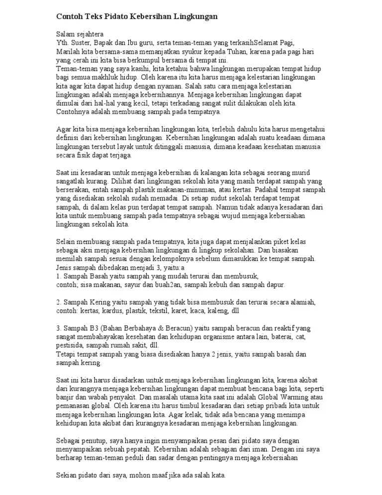 Contoh teks naskah pidato tentang kebersihan lingkungan sekolah salah satu hal yang . Yang terhormat perwakilan wwf indonesia Berikut ini adalah contoh pidato lingkungan yang dibacakan pada saat acara penanaman pohon di daerah reboisasi: Menjaga kebersihan lingkungan sekolah dapat dilakukan dengan cara membuang sampah yang ada di lingkungan sekolah kita ke tempat sampah, . Lah saya menyampaikan pidato mengenai "menjaga kebersihan di lingkungan sekolah".